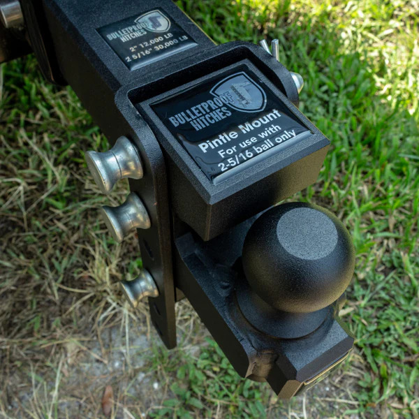 The BulletProof Pintle Attachment is Precision made on our CNC machines. This attachment turns our dual ball setup into a pintle hitch. Lower the loop over the top of the 2-5/16 ball drop our pintle attachment into the hitch channel above the loop insert the supplied hardened pin and you are ready to hit the road!